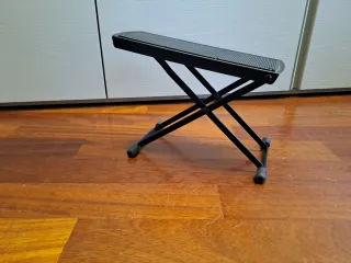 Poggiapiede regolabile in altezza, ideale per chitarristi. - Struttura in metallo nero. - Pedana antiscivolo. - Gambe pieghevoli per un facile trasporto.