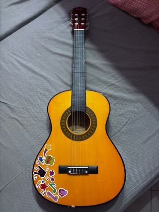 Chitarra classica acustica con finitura lucida e decorazioni. - Cassa armonica in legno. - Tastiera in palissandro. - Meccaniche cromate. - Decorata con adesivi a tema musicale e stelle.