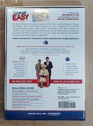 Corso completo Speak Easy per imparare l'inglese, ideato da Clive. Include materiale didattico per un apprendimento facile e divertente. - Metodo infallibile di Clive. - Include 14 DVD. - Include CD. - Con Piero Chiambretti e Elizabeth Richard.