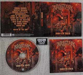 KRISIUN – MORTEM SOLIS 1 Sworn Enemies 3:46 2 Serpent Messiah 4:37 3 Swords Into Flesh 4:19 4 Necronomical 4:12 5 Tomb Of The Nameless 4:28 6 Dawn Sun Carnage (Intro) 1:33 7 Temple Of The Abattoir 5:22 8 War Blood Hammer 4:07 9 As Angels Burn 3:08 10 Worm God 4:41 11 Death Of The Sun 3:30 (Bonus Track) First press CD issued in a 4-panel Digipak with clear tray and 12-page booklet. Digipak and CD in perfect condition.