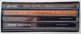 OBITUARY – GODLY BEINGS: Slowly We Rot; Cause Of Death; The End Complete and World Demise. Box set featuring the band’s first four CD, originally released via Roadrunner Records, housed in a slipcase "Box" which holds the four albums, each in an individual jewel case with a clear tray. Released by Dissonance Productions UK in 2025 (cat. no. QDISS40252BX), Box set includes a 36-page booklet, 12 Bonus Tracks and five reproduction postcards featuring classic promotional images of the band. Condition as new. Don’t hesitate to mail for further info or pictures.
