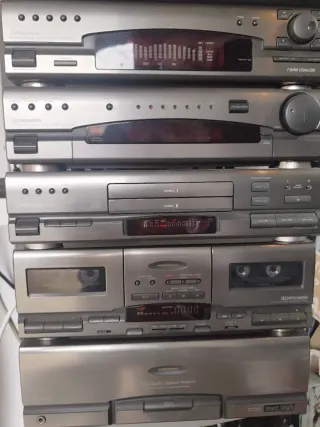 Sistema Hi-Fi a componenti Pioneer MJ300. - Amplificatore integrato. - Lettore CD. - Sintonizzatore. - Equalizzatore grafico a 7 bande. - Lettore cassette. - Design elegante in alluminio spazzolato. Suona bene ma è da rivedere tutto il sistema, ormai è una passione che non mi attira più, se invece sai come smanettare ti ritrovi un gioiello giapponese. Non sono presenti gli altoparlanti