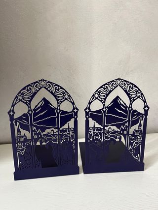 Set di fermalibri ispirati ad Acotar. Fairyloot. Perfetti per gli amanti della saga. - Design traforato con dettagli architettonici e montuosi. - Colore blu scuro. - Materiale metallico. Piccolo difetto visibile in foto.