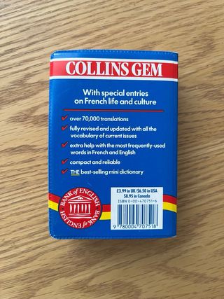 Mini dizionario Collins Gem Francese-Inglese/Inglese-Francese. Copertina anti-schizzi. Dimensioni: 11,7x8x3,5 cm.