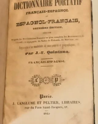 Nuovo dizionario portatile - Francese-Spagnolo - e Spagnolo-Francese - seconda edizione, compilato a partire dai dizionari francesi più completi, i dizionari dell'Accademia Spagnola; di Nuñes de Taboada, Martinez, ecc. di Quintana JF J. LANGLUME 1843.Rilegato. Discrete condizioni, copertina usurata, testa del dorso poco leggibile, volpi. 727 pagine. T. Informazioni aggiuntive Classificazione decimale Dewey: 443 - Dizionario francese