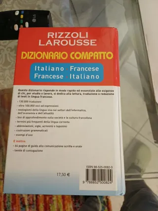 Dizionario bilingue Francese - Italiano ◼️ Italiano - Francese di Larousse Sansoni, 2006. Copertina rigida, rilegatura flessibile, coniugazioni dei verbi. Formato 19 x 25 x 9. 2,8kg netti. Ottimo vocabolario per le scuole superiori o l'università. Nome cancellato dalla prima pagina vuota ma la carta è rimasta un po' ingiallita e sgualcita. Per il resto è come nuovo, senza alcun segno di usura. Con scatola, senza CD ROM. ISBN 8852501762 9788852501760