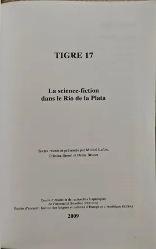 La fantascienza nel Rio de la Plata 2009 Testi in spagnolo e francese 232 pp. Tigre, n. 17 ISBN 978-2-84310-134-2
