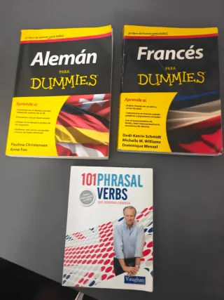 Set ideale per imparare le lingue da soli. Include: Francese per Dummies (interno perfetto, copertina con angolo mancante), Tedesco per Dummies (come nuovo), 101 Phrasal Verbs (Vaughan) (molto pratico), L'irrésistible appel de Mozart (romanzo in francese). PREZZI: PACCHETTO COMPLETO: 25€. Separatamente: Tedesco (10€), Inglese (7€), Francese (7€ per danno copertina), Romanzo (5€). Interni tutti ben curati. Consegna a mano o spedizione tramite Wallapop. Guarda il mio profilo per altre cose!