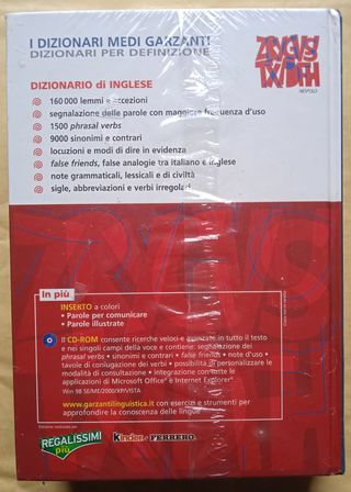 vendo dizionario Inglese-Italiano edizione Grandi Dizionari Garzanti Hazon del 2004, con glossario dei termini di informatica e internet senza sovracopertina, ma con plastificazione protettiva segnalo scritte sui dorsi e prima copertina strappata (vedi foto): difetti che non pregiudicano la bontà e solidità del volume nuovo costa 65€