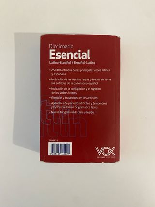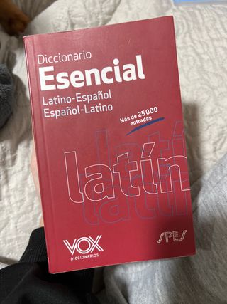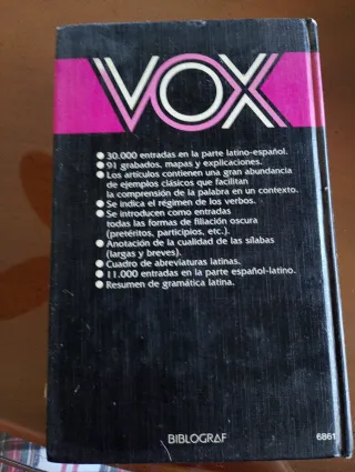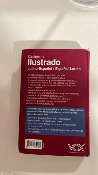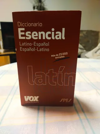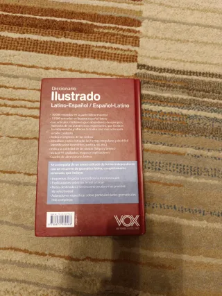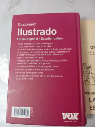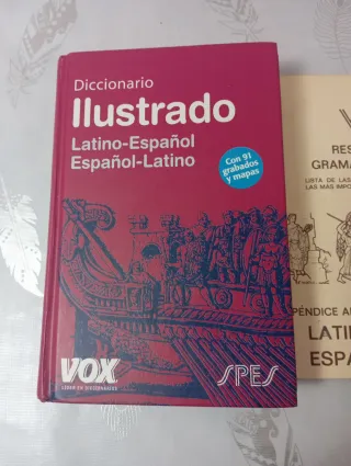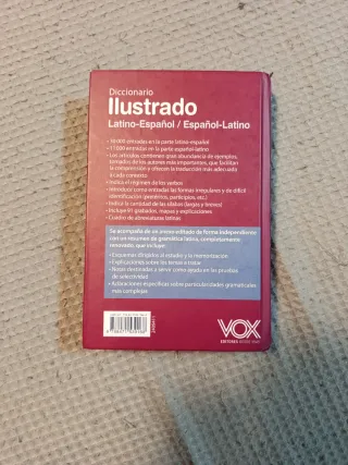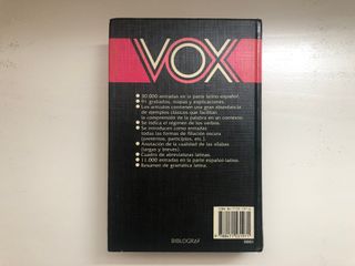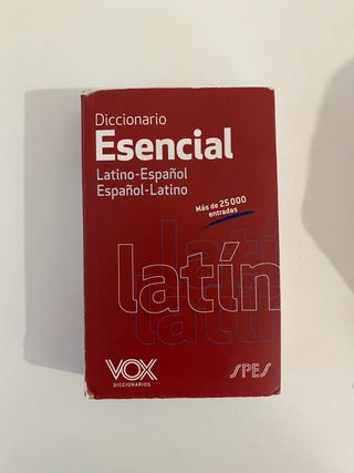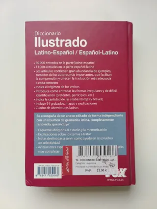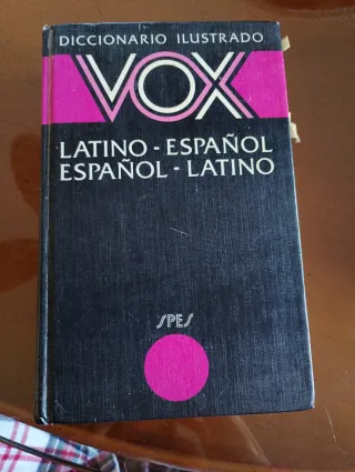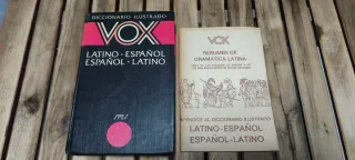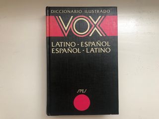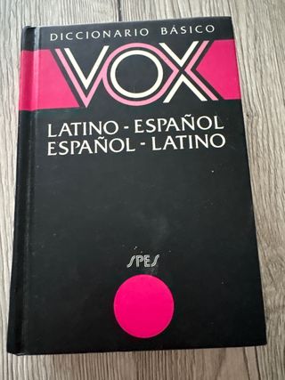 Dizionario Illustrato VOX Latino-Spagnolo e Spagnolo-Latino, 19ª edizione, luglio 1990. Sulla prima pagina c'è un'annotazione cancellata con nastro correttore (Tipp-Ex). Lo spedisco o ci incontriamo a Paterna (Valencia) e lo ritiri di persona. Non contiene l'appendice di grammatica.