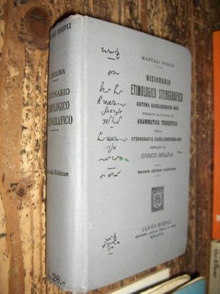 TITOLO: Dizionario Etimologico Stenografico AUTORE: Enrico Molina EDITORE: Ulrico Hoepli Anno: 1922 NOTE: Sistema Gabelsberger - Noe preceduto da un sunto di Grammatica Teoretica della Stenografia Ganelsberger Noe compilato da Enrico Molina - II edizione inalterata Hoepli 1922 cm 15,5 X 10,5 - pp. 624 + 64. peso gr. 395 copertina rigida Tutta tela editoriale con titoli al piatto e al dorso. MILANO HOEPLI EDITORE 1922 · Stato Conservazione: OTTIMO - Il volume si presenta decisamente in ottime condizioni, Intonso e PERFETTO all’interno. Lievissimi e i segni del tempo all’esterno, che si concretizzano prin