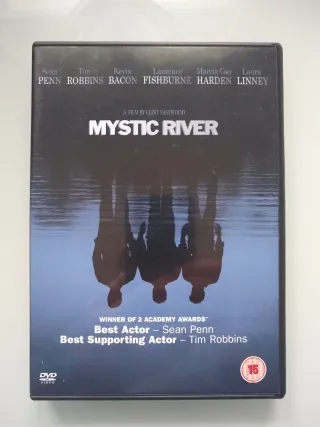 Film Mystic River in DVD format, directed by Clint Eastwood. Features a cast including Sean Penn, Tim Robbins, Kevin Bacon, Laurence Fishburne, Marcia Gay Harden, and Laura Linney. - Winner of 2 Academy Awards: Best Actor (Sean Penn) and Best Supporting Actor (Tim Robbins).