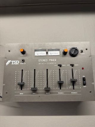 Mixer stereo TSD Elettronica. - Modello SS M-1055 B. - Ingresso Mike-in. - Controlli Pan-Pot, Level, Aux, Phono. - Indicatori Left e Right. - Fader per Mike, Aux I, Aux II, Phono I, Phono II. - Selettori Mag, Cry.