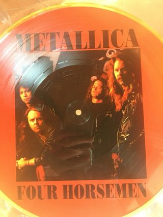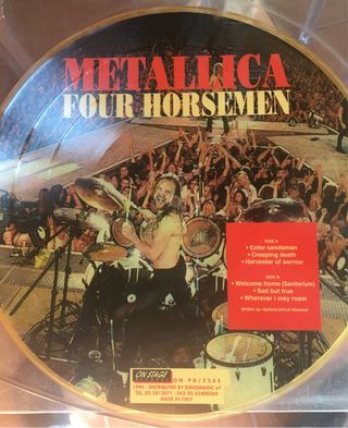 Vinile picture disc dei Metallica Four Horsemen. - Lato A: Enter Sandman, Creeping Death, Harvester of Sorrow - Lato B: Welcome Home (Sanitarium), Sad But True, Wheraver I May Roam - Distribuito da Discomagic srl nel 1994 - Made in Italy - mai usato - lievemente ingiallito dal tempo