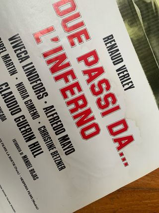 Locandina originale del film A due passi da... l'inferno. in condizioni come da foto. Mai affisso. Leggera piega centrale. segni di umidità. 70x33 circa. - Titolo: A due passi da... l'inferno - Attori principali: Renaud Verley, Viveca Lindfors, Alfredo Mayo, Maribel Martin, Nuria Gimeno, Christine Betzner - Regia: Claudio Guerin Hill - Musica: Adolfo Waitzman - Fotografia: Manuel Rojas - Sceneggiatura e dialoghi: Santiago Moncada