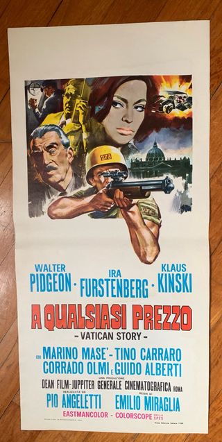 Locandina originale del film A Qualsiasi Prezzo (Vatican Story). Mai affisso, in condizioni come da foto: piega centrale e segni di umidità - Titolo originale: A Qualsiasi Prezzo - Sottotitolo: Vatican Story - Attori principali: Walter Pidgeon, Ira Furstenberg, Klaus Kinski - Altri interpreti: Marino Mase, Tino Carraro, Corrado Olmi, Guido Alberti - Regia: Emilio Miraglia - Produzione: Dean Film-Jupiter Generale Cinematografica Roma - Formato: Eastman color, Colorscope