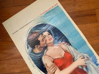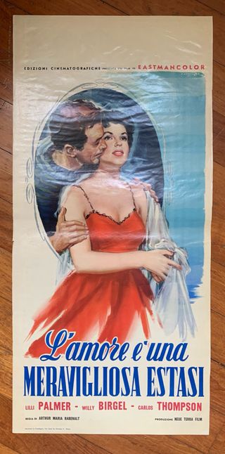 Poster originale del film L'amore e' una meravigliosa estasi. Mai affissa. stropicciata e piegata come da foto. Design: Cesselon Cm. 70x33 circa - Presenta un'illustrazione a colori. Attori principali: Lilli Palmer, Willy Birgel, Carlos Thompson. - Prodotto da Neue Terra Film.