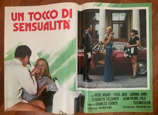 Fotobusta originale del film Un tocco di sensualità. Mai affissa. Piegata come da foto. Cm. 65x45 circa - Titolo: Un tocco di sensualità - Attori: Rose Nougy, Yves Jofa, Jaonna Jung, Elisabeth Felchner, Jean Pierre Zola - Regia: Charles Ferrer - Produzione: Werner Kunz - Tecnica: Technicolor - Distribuzione: Pantheon Film