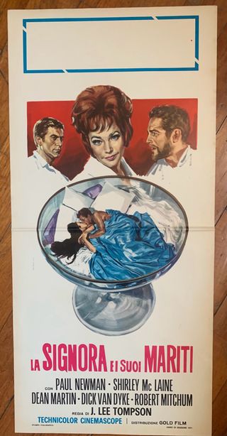 Locandina originale del film La Signora e i Suoi Mariti. Mai affissa. Piegata come da foto. Cm.70x33 circa - Regia di J. Lee Thompson. - Con Paul Newman, Shirley MacLaine, Dean Martin, Dick Van Dyke, Robert Mitchum. - Tecnicolor Cinemascope.
