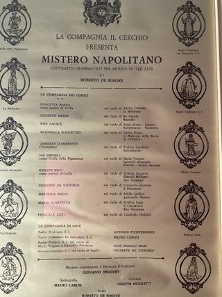 Locandina originale per lo spettacolo teatrale Mistero Napolitano della Compagnia Il Cerchio. - Testo di Roberto De Simone. - Grafica d'epoca con illustrazioni. - Ideale per collezionisti e appassionati di teatro.