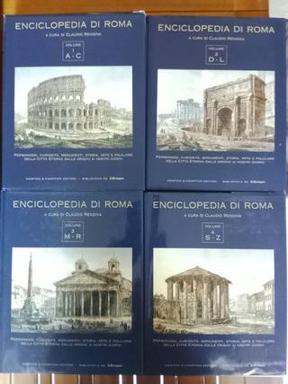 Enciclopedia di Roma. Personaggi, Curiosità, Monumenti, Storia, Arte e Folclore della Città Eterna dalle Origini ai Nostri Giorni. in 4 Volumi con cartonato originale. Prima edizione. di Claudio Rendina (Autore) Newton Compton In-8 , 4 volumi, cartonato editoriale, s sovraccoperta editoriale illustrata, custodia illustrata, pp. 1377, numerazione continua, numerose illustrazioni in bianco e nero nel testo. Minime abrasioni da scaffale agli angoli del cartonato Editore: Newton & Compton 1° edizione (31 dicembre 2004) Lingua: Italiano Testi con copertina rigida e sovraccoperta 1377 pagine. illustrate in BN ISBN-10: 8854103012
