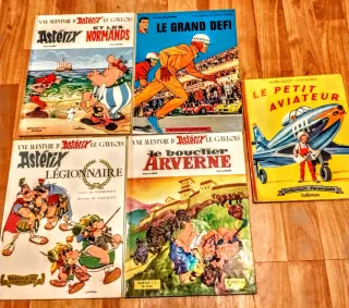 Set di 5 fumetti in lingua francese, Vintage anni '60 principalmente della serie Asterix di Goscinny e Uderzo, insieme ad altri due titoli. Gli Asterix e La Grande Sfida sono in ottimo stato. " Le Petit Aviateur" e' in condizioni discrete. I fumetti di Asterix presenti sono: Astérix et les Normands (Asterix e i Normanni), Astérix Légionnaire (Asterix Legionario), Le Bouclier Arverne (Lo scudo degli Arverni), e Une aventure d'Astérix le Gaulois (Un'avventura di Asterix il Gallico). Gli altri fumetti includono Le Grand Défi (La grande sfida) di Jean Graton, con illustrazioni di auto da corsa come Ferrari e Delahaye.