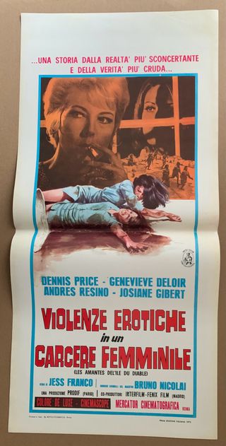 Locandina originale del film Violenze erotiche in un carcere femminile (Les amantes del'ile du diable). Mai affissa. Piega centrale visibile in foto. Misura circa cm. 70x33 - Titolo originale: Violenze erotiche in un carcere femminile - Regia: Jess Franco - Musiche: Bruno Nicolai - Produzione: Prodif (Parigi), Interfilm-Fenix Film (Madrid) - Formato: Colore de Luxe, Cinemascope