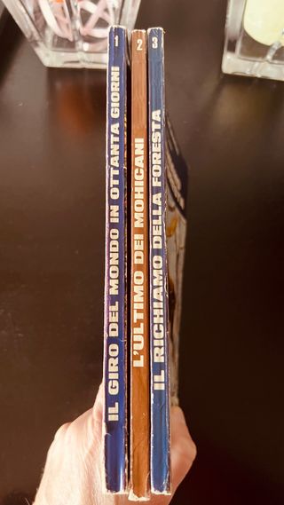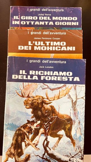 3 volumi in buono stato, presenti alcune pieghe sulle copertine. Il giro del mondo in ottanta giorni. L’ultimo dei mohicani. Il richiamo della foresta.