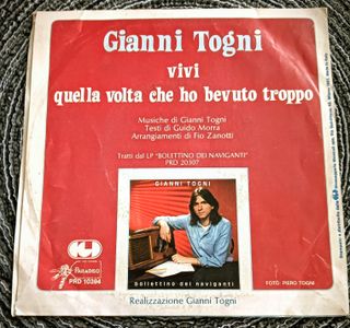 Vivi Gianni Togni 1982 – Italy Vinile, 7", 45 RPM Ottimo Paradiso (2) – PRD 10394, CGD – PRD 10394 - Copertina con il nome dell'artista e il titolo del brano. - Sfondo rosso acceso.