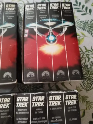 Collezione di cofanetti VHS di Star Trek in lingua italiana. Contiene diversi titoli della saga. - Il naufragio delle stelle - Guerra incredibile - Gli anni della morte - Le parole sacre - Dominati da Apollo - Pianeta Deneva - Ritorno al domani - La magnificenza del re - L'alternativa - Domani è ieri - La sfida - Diario del capitano - Incidente all'Enterprise - Elena di Troia - Il duplicato - Un tuffo nel passato - Io, Mudd