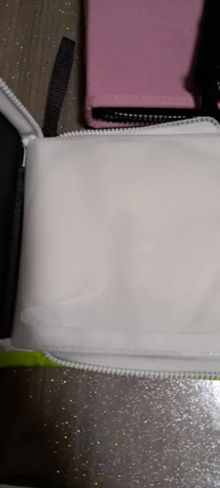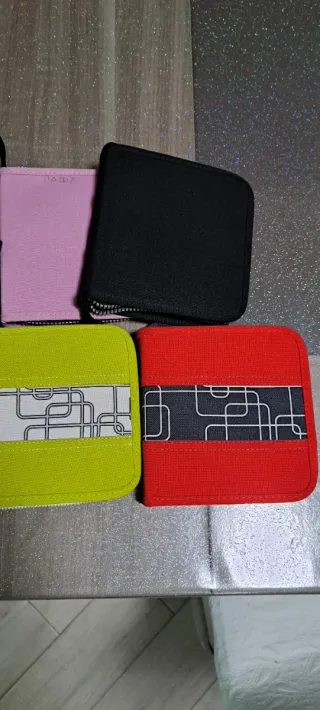 Set di porta CD con diverse fantasie e colori. - Porta CD rosa - Porta CD nero. - Porta CD verde con fantasia geometrica. - Porta CD rosso con fantasia geometrica.