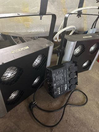 Vendo coppia di luci a LED professionali con centralina. - Luci con 4 faretti ciascuna. - Centralina DMX con 4 uscite. - Staffe di montaggio incluse.