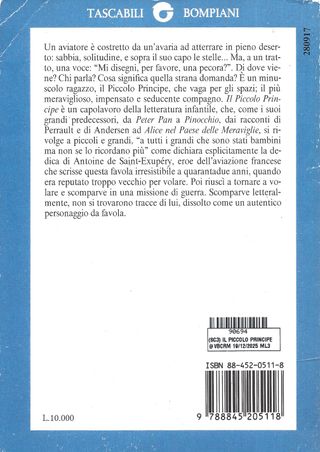 (SC3) IL PICCOLO PRINCIPE SAINT-EXUPERY LIBRO EDIZ ITALIANA TASCABILI USATO ML3 90694 - Libro usato buono stato 25° edizione italiana Bompiani 1992 di c/a 121 pagine - copertina flessibile e pagine integre ma con firma a penna e usura ad angoli VEDI FOTO