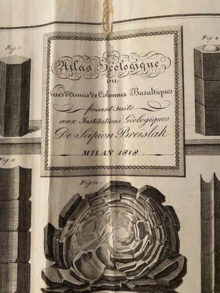 Atlas géologique ou vues d'amas de colonnes basaltiques faisant suite aux Institutions géologiques de Scipion Breislak Milano 1818 mm 230x375) Con 1 carta di Avis, 1 frontespizio + 53 tavole numerate 1-53 e Plan A-B. Anno 1818. Acquaforte e al bulino da Gaetano Riboldi e Giuseppe Dall'Acqua. Mancante di copertina, la prima pagina e staccata dal libro , le ultima pagine presentano segni di macchie . Nel complesso tutte le stampe sono in ottime condizioni .