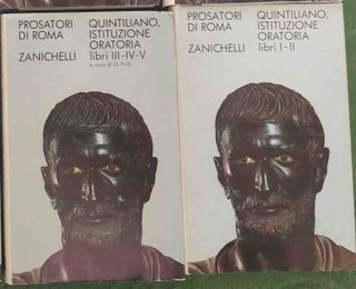 Si tratta di due libri (prima edizione) della collana Prosatori di Roma pubblicata da ZANICHELLI. I libri hanno il testo latino con a fronte la traduzione in italiano. I libri sono in ottime condizioni, senza annotazioni, hanno normali segni di invecchiamento, con lieve ingiallimento ai margini pagina. La copertina rigida e dotata di sovracopertina. Marco Fabio QUINTILIANO "Istituzione Oratoria Libri I-II" (Prima ed. 1972) Marco Fabio QUINTILIANO "Istituzione Oratoria Libri III-IV-V" (Prima ed. 1973)