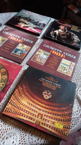 Lotto di 50 vinili di Giuseppe Verdi, tra cui diverse edizioni di Aida, più libri in omaggio. - Aida (3 dischi) con Stilla, di Stefano, Simionato, Gui, Zaccaria. - Aida (1 disco) con gli Eroi della Musica, Antonietta Stella, Gui, Simionato, Cossotto, Zaccaria. - Aida (Teatro alla Scala) con Giuseppe Verdi, Macbeth, Don Carlos, Simon Boccanegra. - Il Corsaro (Verdi). - Fidelio (Beethoven).