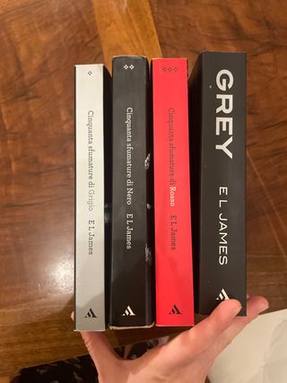 Stock di 4 libri di E.L. James comprendenti: -“Cinquanta sfumature di grigio” (ottime condizioni a parte scritta in foto). Edizione Mondadori, 2012 -“Cinquanta sfumature di nero” (buone condizioni, alcune imperfezioni indicate in foto). Edizione Mondadori, 2012 -“Cinquanta sfumature di rosso” (nuovo). Edizione Mondadori, 2012 -“Grey” (nuovo). Edizione Mondadori, 2015. Tutti i volumi sono vendibili singolarmente ai seguenti prezzi: -“Cinquanta sfumature di grigio”: 5€ -“Cinquanta sfumature di nero”: 3€ -“Cinquanta sfumature di rosso”: 6€ -“Grey”:6€