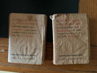 Vendo due volumi tascabili de La Divina Commedia di Dante Alighieri, con note di G. L. Passerini, pubblicati dalla storica casa editrice G. C. Sansoni di Firenze (stima primi del '900). Volumi inclusi: Vol. II – Purgatorio Vol. III – Paradiso Questi libri sono perfetti per collezionisti di edizioni classiche o come autentici oggetti decorativi vintage. NOTA SULLE CONDIZIONI: Si tratta di libri antichi e presentano segni significativi del tempo: copertine in carta logore, pagine ingiallite e macchie evidenti.