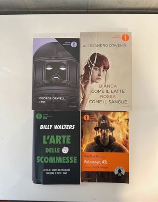 4 libri di romanzi e narrazioni famose Oscar. Le condizioni sono pressoché perfette,solo “L’arte delle scommesse” presenta piccole imperfezioni. Il lotto è a meno della metà del prezzo a cui si troverebbero i libri.