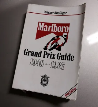 Marlboro Grand Prix guide 1949-1987. Raro volume ufficiale della Federazione motociclistica internazionale che racconta, con tutti i dati e tutti i nomi la storia del motociclismo mondiale di velocità su pista. Copertina morbida in plastica, 550 pagine.