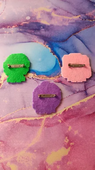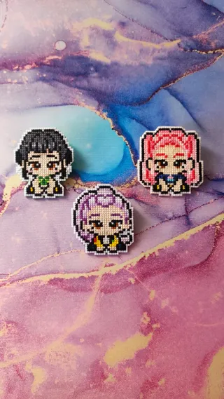 Set di spille Kpop a tema Demon Hunters. Sono realizzate a mano. Design ispirato ai personaggi: Rumi, Zoey e Mira. Realizzate a mano con tecnica punto croce. Costo complessivo per tutte e tre le spille: 10€