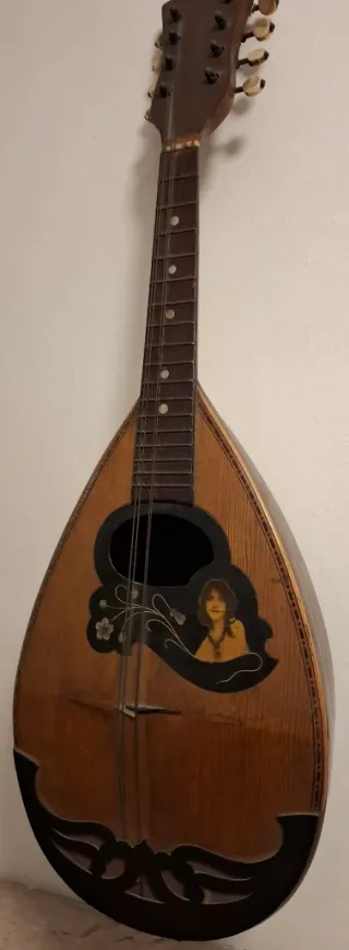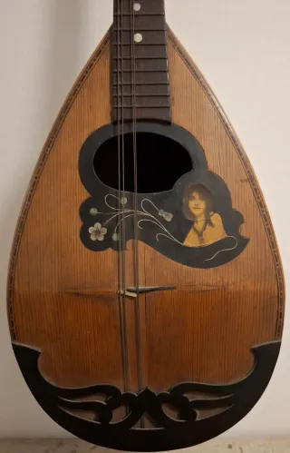 Mandolino in legno con un'elegante decorazione sul corpo. - Strumento musicale con corde. - Dettagli floreali e figura femminile. - Bordatura decorativa sul corpo.