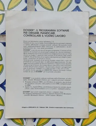 UN PROGRAMMA CHIAMATO DOSSIER® – Edizione 1984 (rara). Opuscolo originale Edizioni Elettroniche Mondadori in collaborazione con ZEROUNO, curato da Etnoteam (Milano). Manuale introduttivo al software gestionale per personal computer, con esempi pratici su dossier elettronici, fatturazione, costi del personale e gestione bancaria. Documento storico per appassionati di informatica vintage ed early software. Condizioni come da foto, con i normali segni dei 42 anni trascorsi