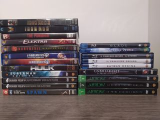 - Dvd Spawn - Cofanetto con 4 dvd della saga di Batman - Cofanetto con 4 dvd della saga di Superman - Dvd Superman Returns - L'incredibile Hulk 2 dvd edizione speciale - Cofanetto con 2 dvd de I fantastici 4 - Dvd Daredevil Director's Cut - Dvd Elektra - Dvd The Punisher - Iron Man Ultimate edition 2 dvd - Iron Man 2 edizione speciale 2 dvd - Unbreakable il predestinato collector's edition 2 dvd - Arrow 1 Stagione completa 5 dvd - Arrow 2 Stagione completa 5 dvd - Arrow 3 Stagione completa 5 dvd (ancora sigillato) - Lanterna Verde Blu Ray e Dvd - Blu Ray Batman Il cavaliere oscuro (ancora sigillati) - Blu Ray Blade