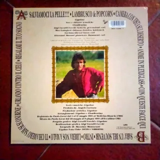Vinile dell'artista Ligabue, intitolato Lambrusco coltelli rose & popcorndel 1991 - Copertina con grafica a tema. - Etichetta discografica visibile. - Libretto titoli canzoni.