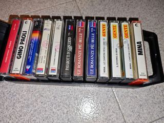 Vendo 12 audiocassette varie con contenitore, tra cui Mina, Luciano Pavarotti, Gino Paoli, Andrea Bocelli Dimensioni 28x12x8 cm
