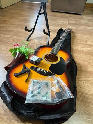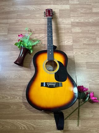Chitarra acustica con finitura sunburst, ideale per chi inizia a suonare. - Corpo in legno con sfumature di colore. - Manico in legno con tastiera. - Sei corde metalliche.
