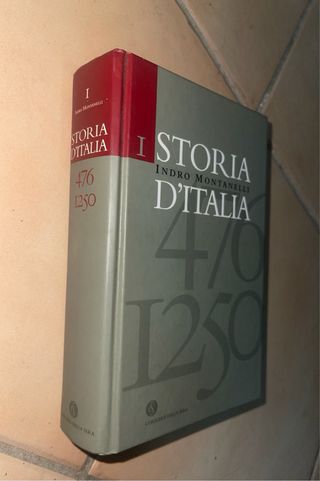 Il libro mostrato nell'immagine fa parte della celebre collana "Storia d'Italia" scritta da Indro Montanelli (e successivamente con Mario Cervi). Contenuto generale: L'opera è una vasta cronaca degli eventi italiani, che copre un arco temporale molto ampio, dalle origini fino alla fine del XX secolo. Stile: È scritta con un approccio divulgativo e giornalistico, non strettamente accademico, che mira a raccontare la Storia come una "storia" coinvolgente, con un focus sui personaggi principali e uno stile vivace e accessibile a un vasto pubblico. Volume specifico: Il volume in foto, con le date "476" e "1250" impresse, copre specif