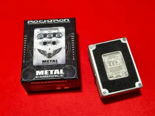 Pedale distorsore per chitarra Rocktron Metal Embrace. - Design compatto e robusto. - Finitura metallica argentata. - Grafica con ali stilizzate e logo. - Tre manopole di controllo e un interruttore a pedale.
