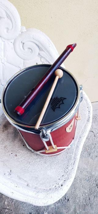 Tamburo e flauto in pvc (tabor & pipe). Buon suono dimensioni diametro cm 20 altezza 28. Flauto tre fori overtone. Si usano entrambi con le mani la dx scandisce il tempo la sx tiene il flauto.